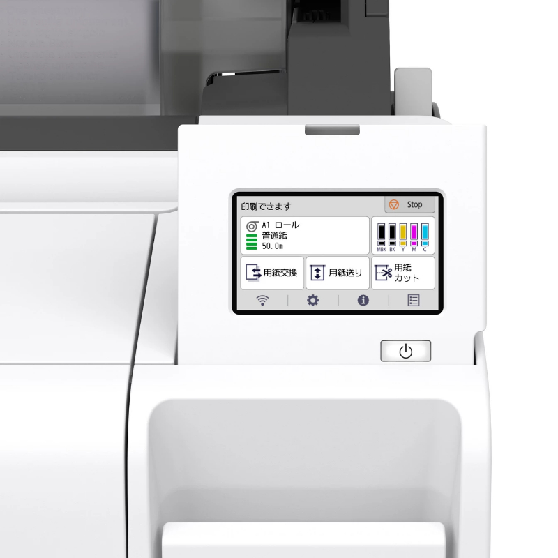 Diseño funcional con un panel de pantalla táctil de 4,3" que muestra instrucciones intuitivas e información importante, como el tipo de soporte, el soporte restante y la cantidad de tinta. El papel en rollo se puede sustituir con facilidad a través de la cubierta superior frontal.