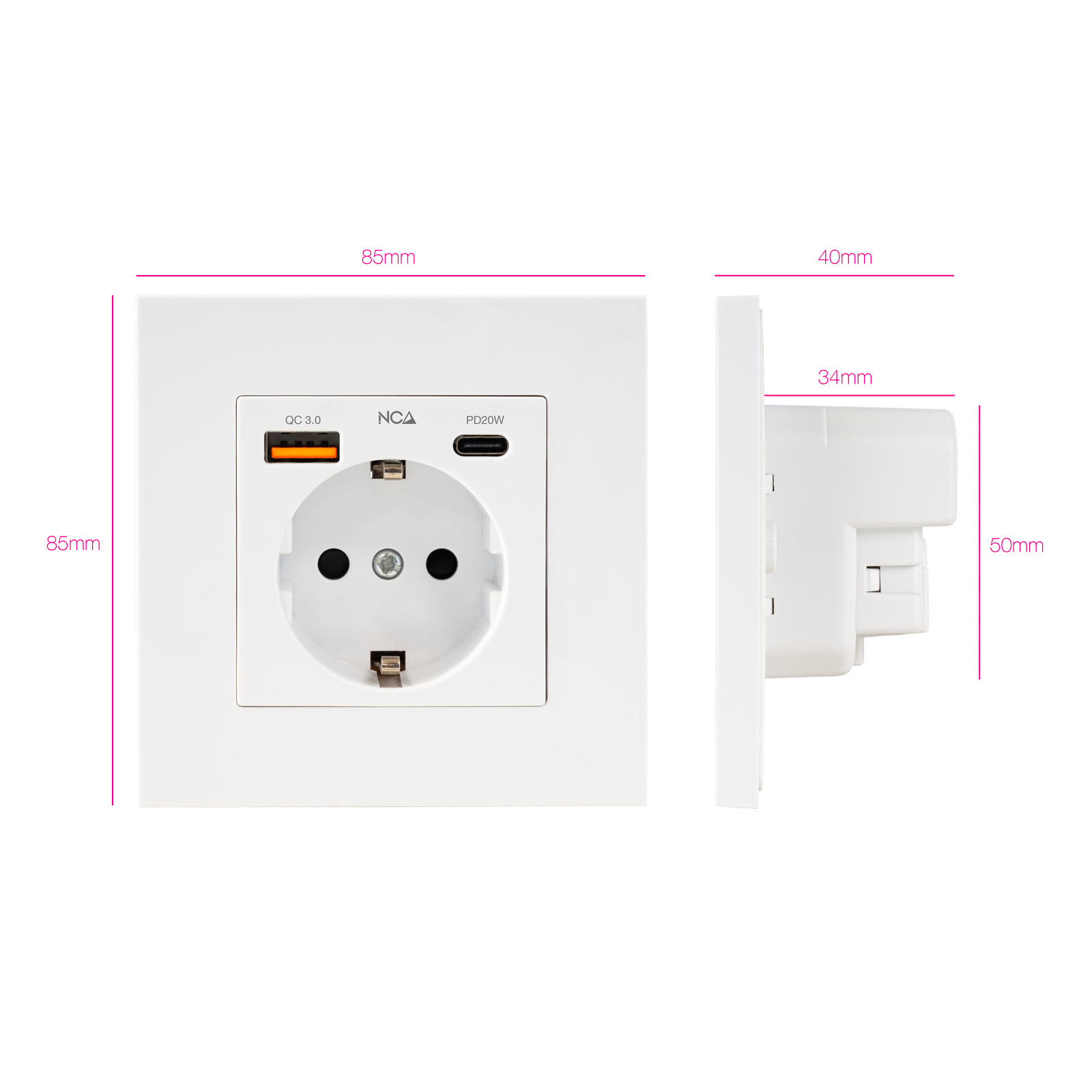 Enchufe CEE 7/3 + USBA QC 3.0 + USBC PD 20W / 16A250V / Blanco / Para cajetín universal