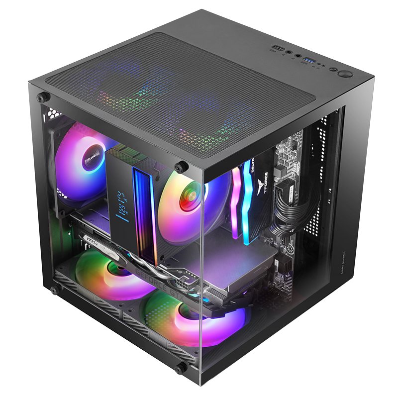 Caja MicroATX / 1×3.5" HDD + 2×2.5" SSD / 1×ARGB / Hasta 5×120 mm / USB 3.0 + USB-C / Cristal templado / Negro