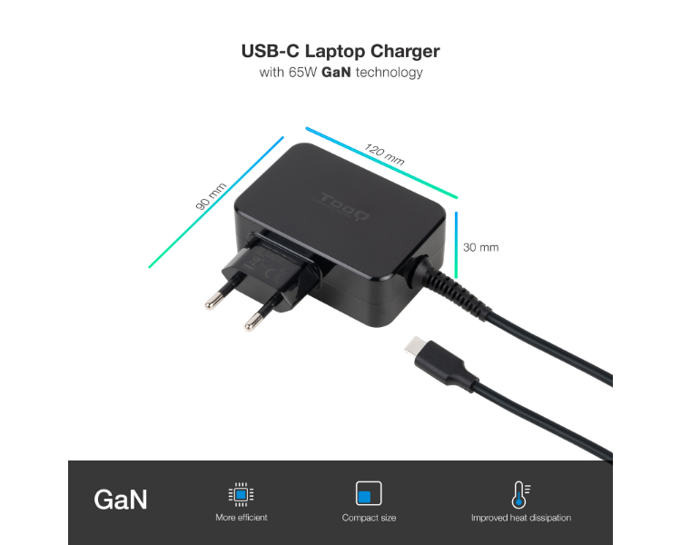 CARGADOR AUTOMATICO PORTATIL GAN USB-C PD 65W NEGRO TOOQ