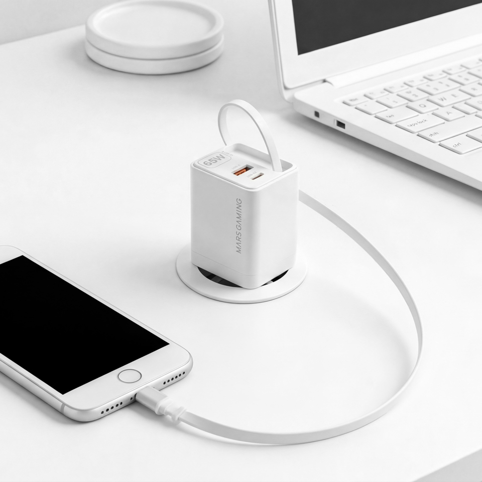 Cargador USB GaN 65W blanco con USB-C + USB-A y cable USB-C retráctil integrado.